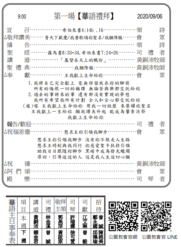 9/20(日)兩堂禮拜 講道:黃銅沛牧師
