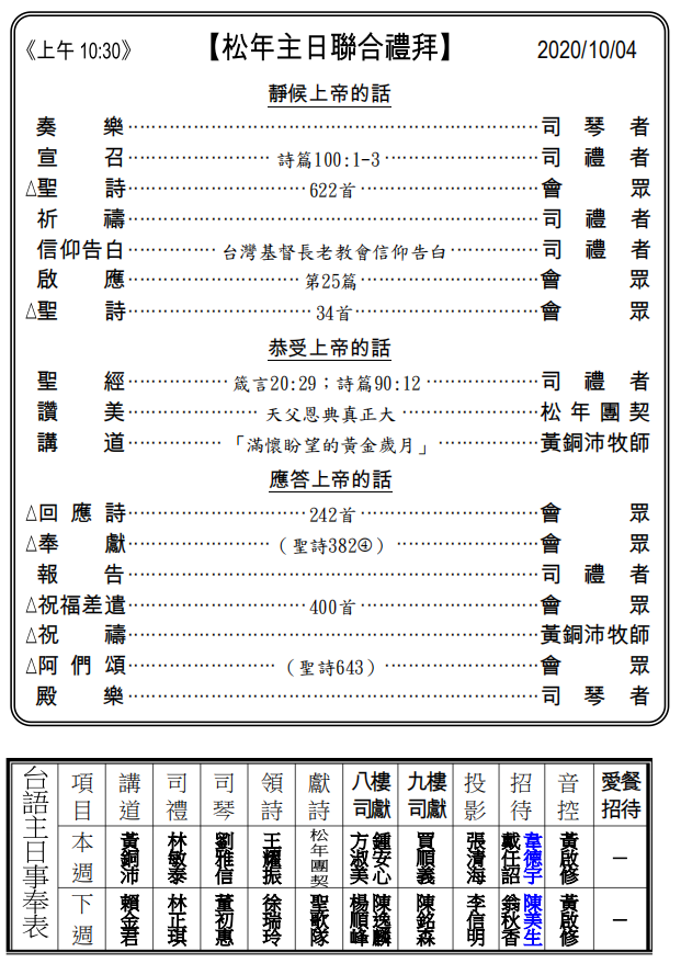 - 本主日(10/4)兩堂禮拜聯合舉行,時間/10:30;本主日為松年主日,感謝松年團契參與主日禮拜各項服事。