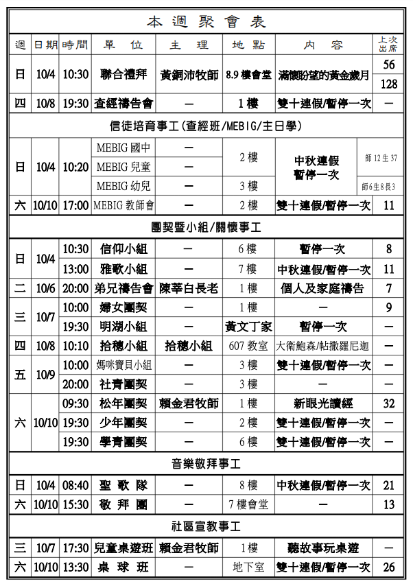 - 本主日(10/4)逢中秋節連假,願上帝賜福兄姊闔家出入平安蒙福。