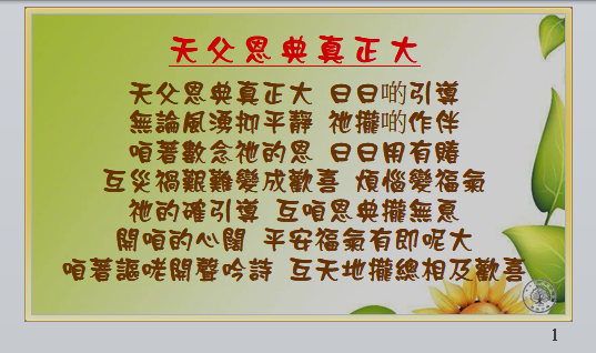 - 新笙合唱團10/25(日)受邀於本會台語禮拜中獻詩,獻詩曲目: