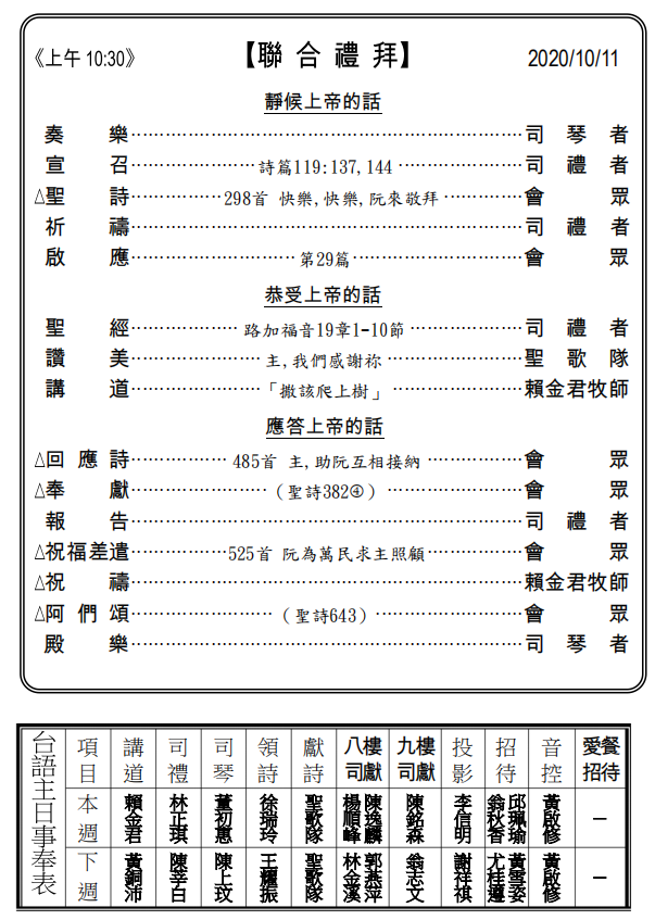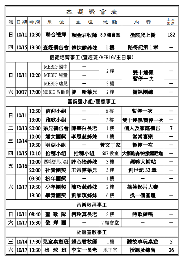 - 下週主日(10/18)聯合禮拜召開長執改選臨時會員和會,禮拜時間/上午9:00,請兄姊準時並踴躍出席。
