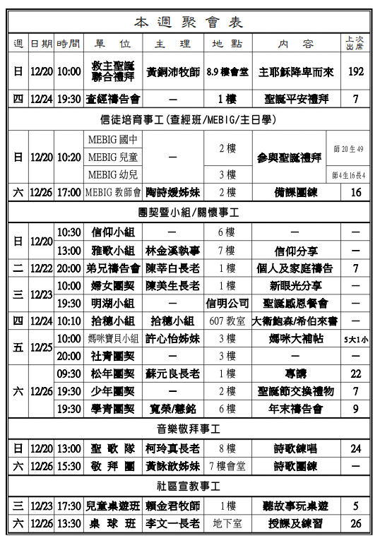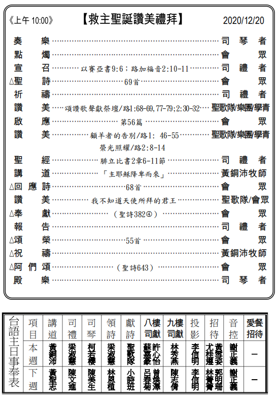 12/24(四)晚上8:00報佳音活動,1)邀請兄姊一起去報佳音 2)希望到府上報佳音的,請向林金溪執事報名,以安排路線。