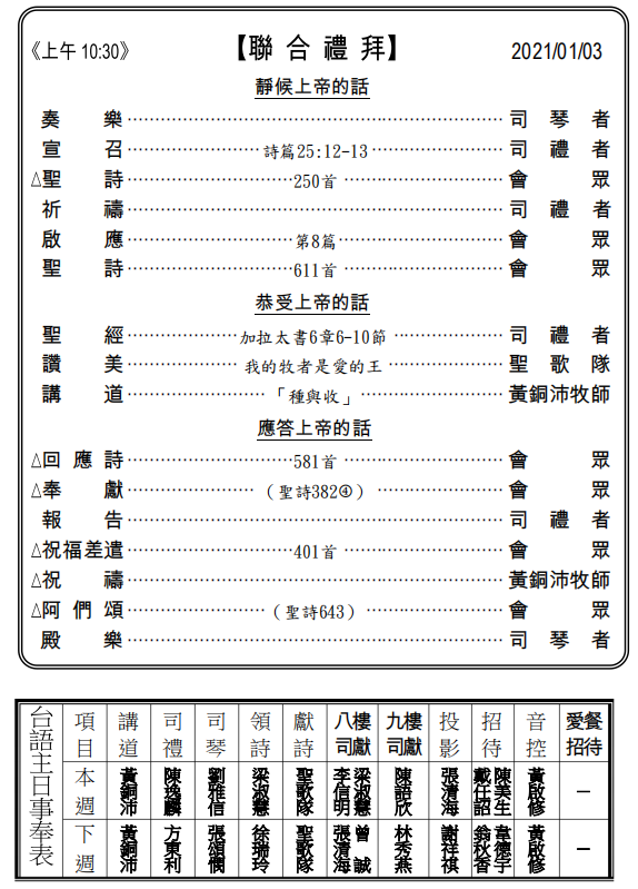 - 下週主日(1/10)台語禮拜中舉行長老封立、執事設立、機構首長就任。