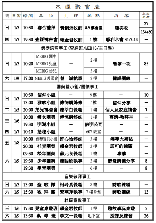 - 本週六(1/9)下午4:00於607教室召開小組事工會議,出席人員另行邀約。