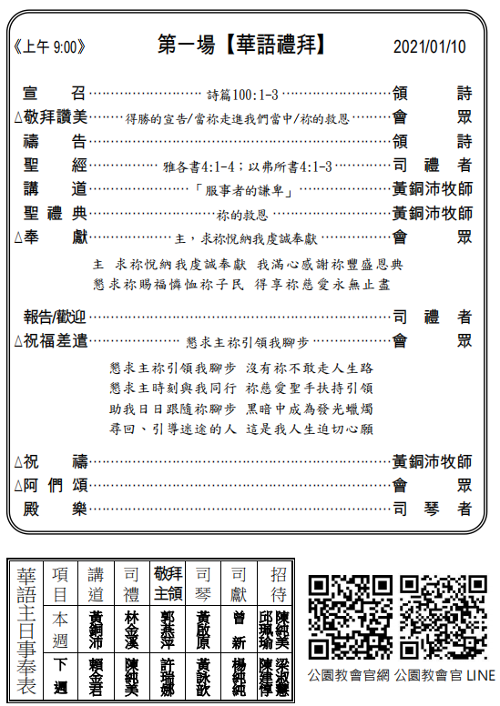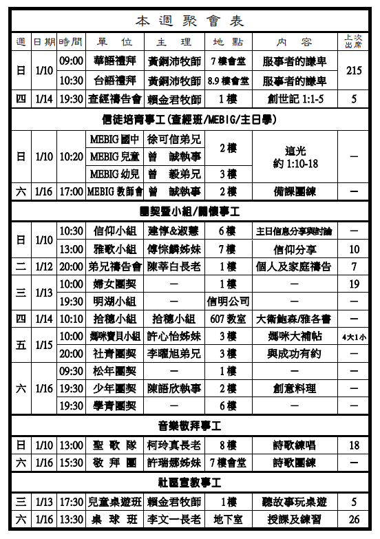 ◎下週主日兩堂禮拜預告(1月17日)