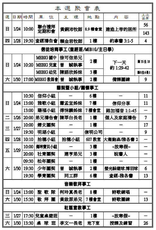 - 本週四(1/28)晚上7:30查經禱告會,主理:賴金君牧師,讀經:約拿書3:1-5。