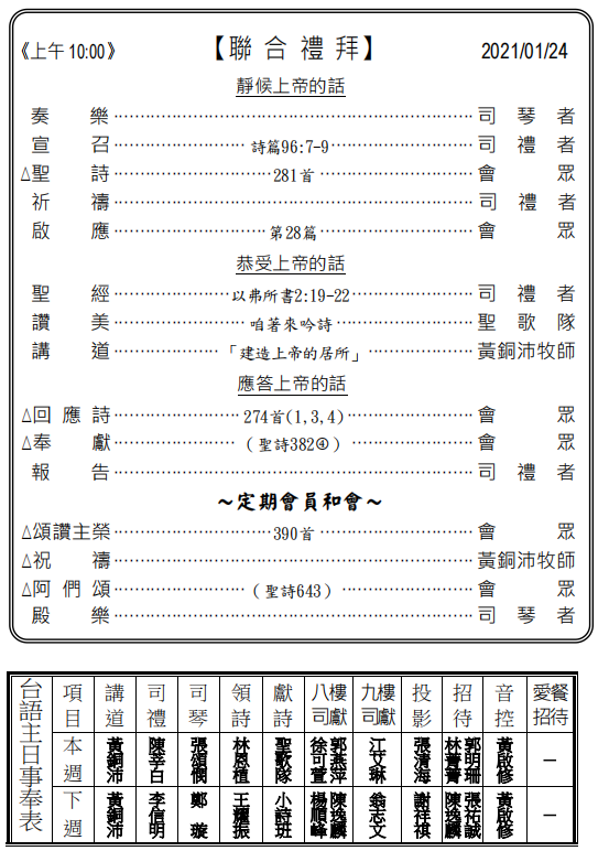 - 本主日(1/24)聯合禮拜中召開2021定期會員和會,聚會時間/上午10:00。