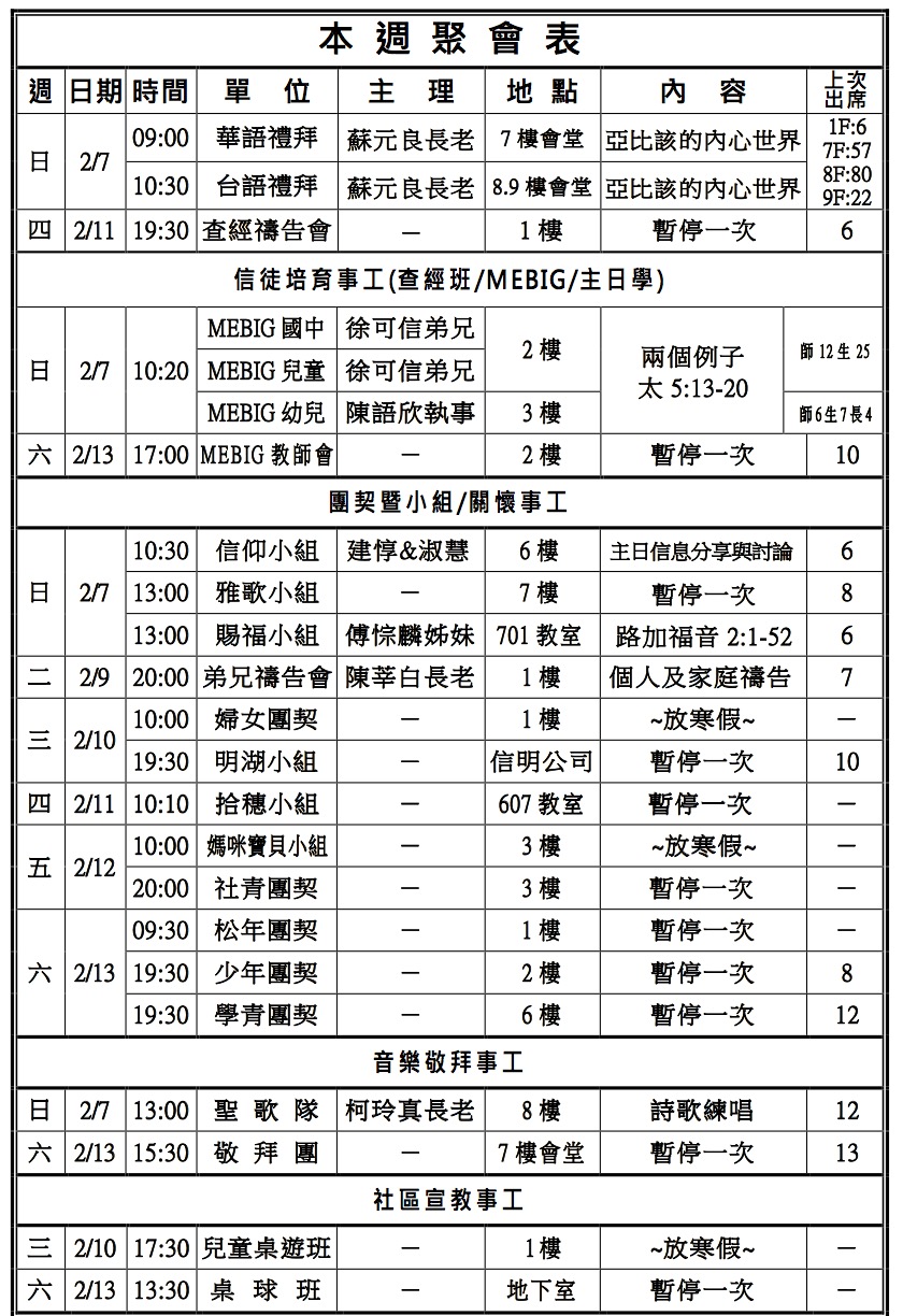 4. 下週四(2/11)晚上查經禱告會逢新春假期,暫停一次;2/18(四)恢復聚會。