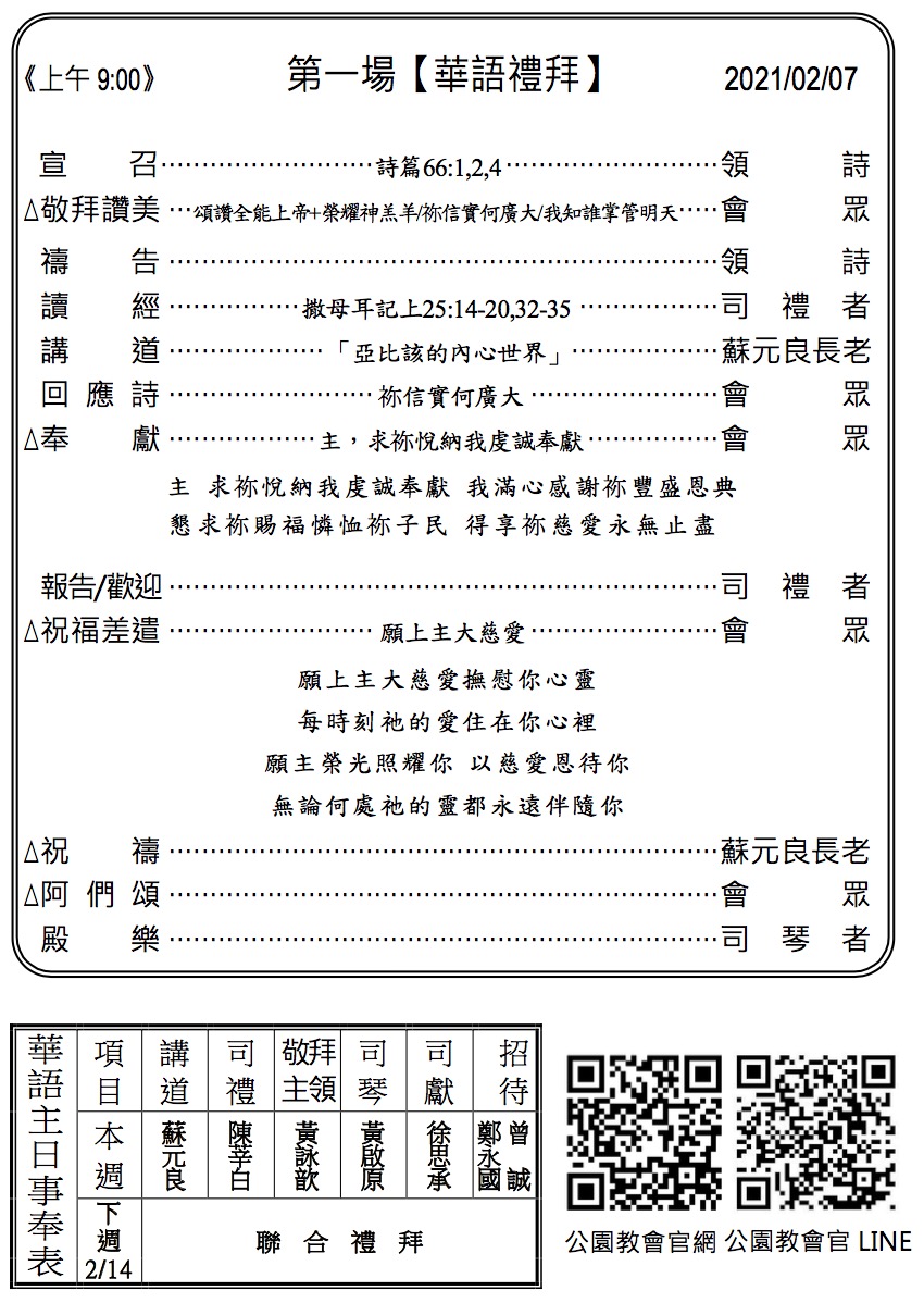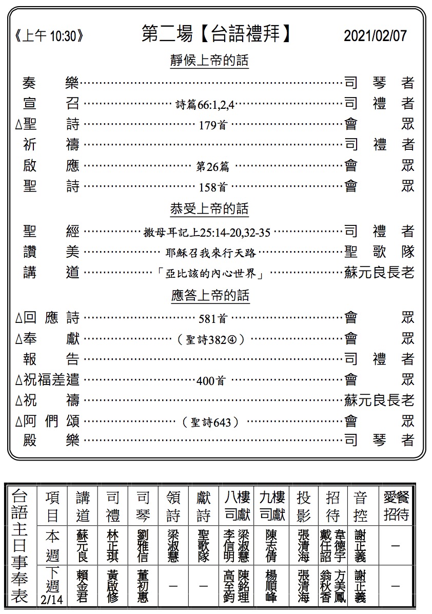 2. 感謝蘇元良長老於本主日(2/7)兩堂禮拜中講道。