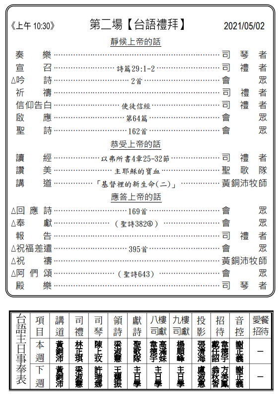 5/16(日)玉山神學院奉獻主日 講道者:華語/方東利長老 台語/何智暐傳道