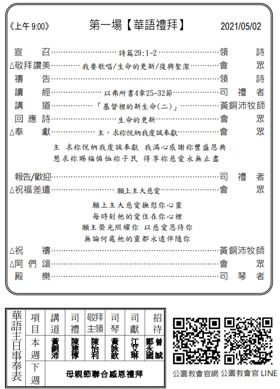 ◎下週主日聯合禮拜預告(5月9日) 上午10:30