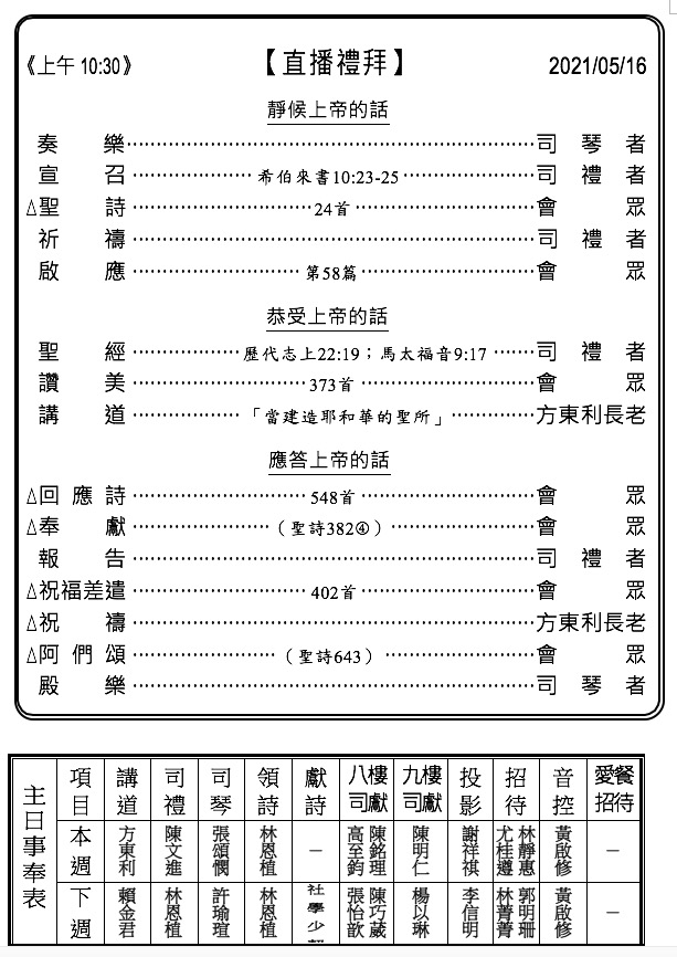 - 上週主日(5/9)母親節禮券準備數量不足,有所短缺,將於本主日兩堂禮拜中補發放,亦可向靜惠幹事直接領取,不便之處敬請見諒。
