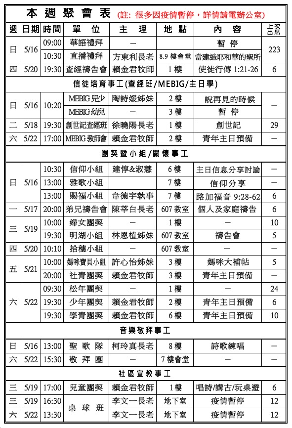 - 下週主日(5/23)為青年主日,由青年團隊服事與見證分享。本主日12:30-13:30於八樓練歌,以及討論青年主日事工視疫情調整。