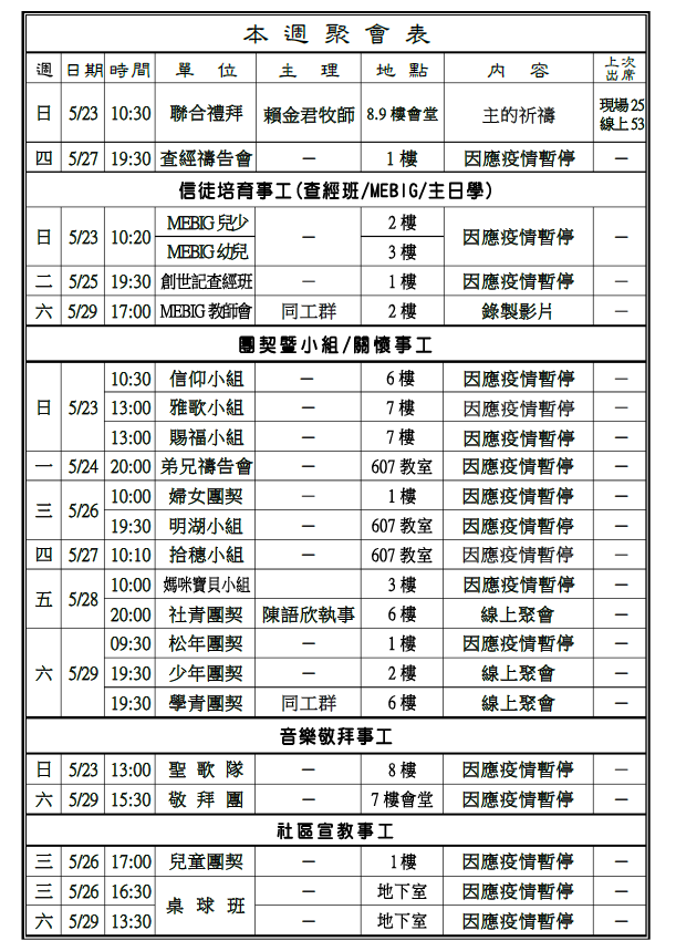 - 主日禮拜程序、講道及服事同工輪值,將因應網路直播禮拜適度調整。