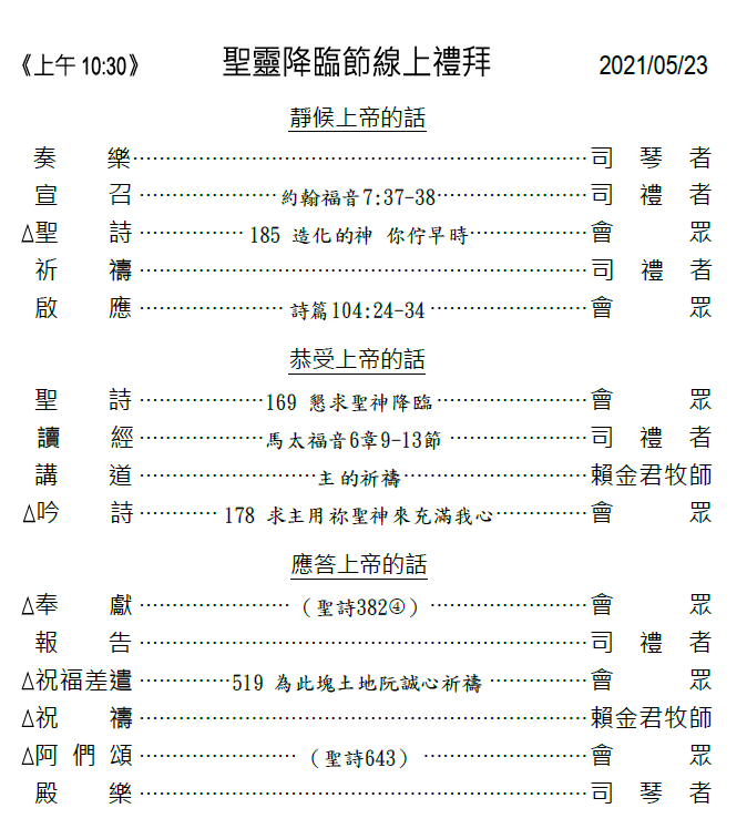 - 本會5/16-6/6暫停主日實體禮拜,以網路直播禮拜實況,請兄姊留在府上,闔家以網路直播參與禮拜。6/6以後的主日禮拜視疫情發展滾動調整。「那真正敬拜父的,要用心和誠實敬拜他。」(約翰福音4:23-24)。