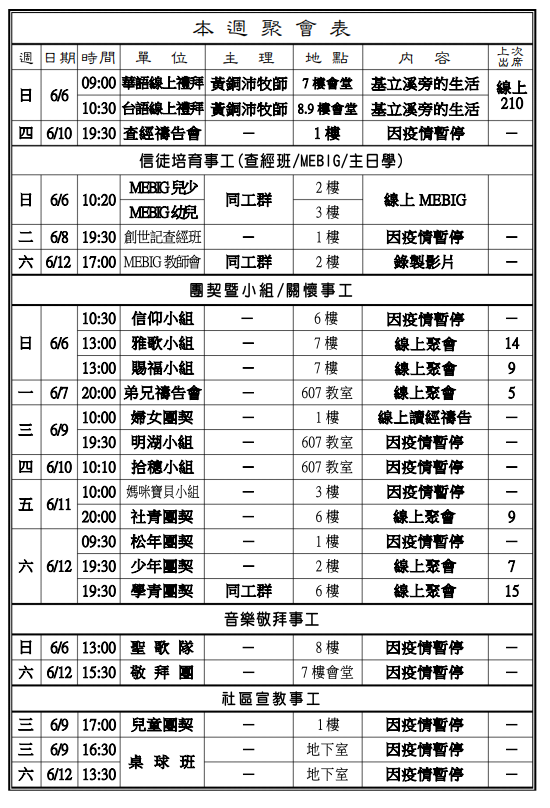 - 本會配合中央防疫政策,5/16-6/14暫停主日兩堂實體禮拜,6/14以後的主日禮拜視疫情滾動調整。請兄姊闔家在府上透過網路直播參加禮拜。