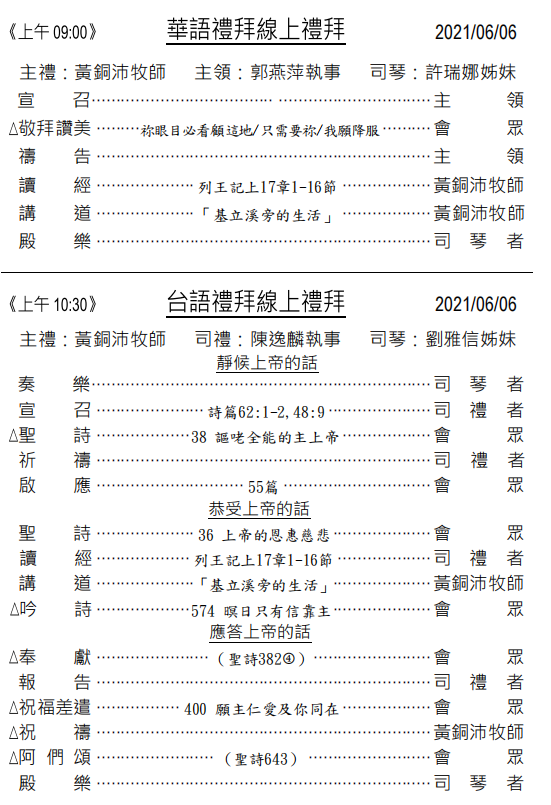 - 本會6/6起每主日開始華語及台語兩堂網路禮拜,歡迎兄姊同心參加敬拜。