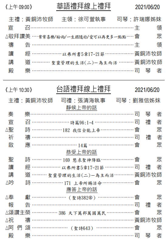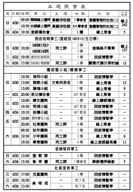 - 本會配合中央防疫政策,6/28之前暫停主日實體禮拜,以網絡視訊進行,視疫情滾動調整。歡迎兄姊闔家在府上透過網路直播參加禮拜。