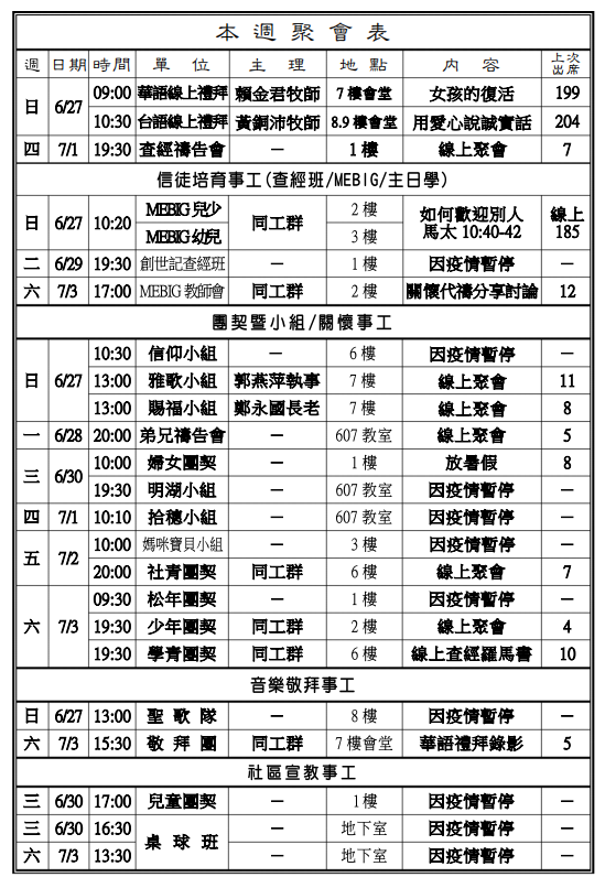 - 防疫政策將全國第三級警戒延到7/12,本會配合中央防疫政策繼續暫停主日實體禮拜,兩堂禮拜以網絡視訊進行,歡迎兄姊闔家在府上透過網路直播參加禮拜。