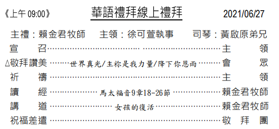 ◎下週主日兩堂禮拜線上禮拜預告(7月4日)