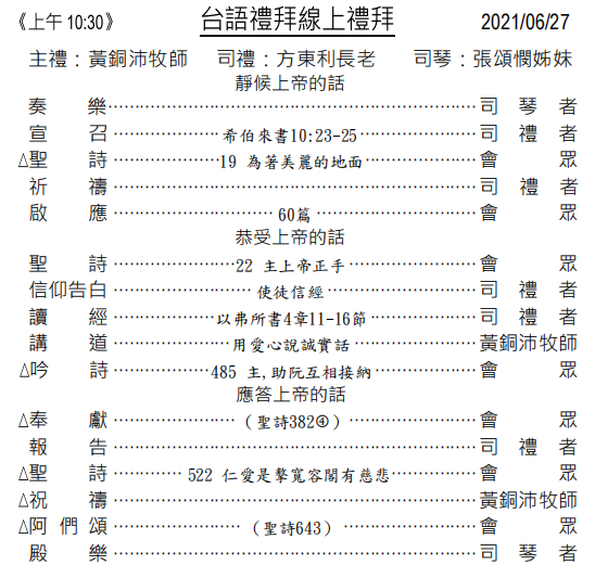 - 防疫政策將全國第三級警戒延到7/12,本會配合中央防疫政策繼續暫停主日實體禮拜,兩堂禮拜以網絡視訊進行,歡迎兄姊闔家在府上透過網路直播參加禮拜。