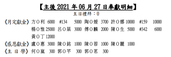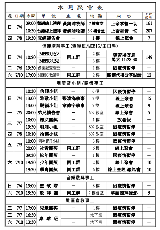 - 防疫政策將全國第三級警戒延到7/12,本會配合中央防疫政策繼續暫停主日實體禮拜,兩堂禮拜以網絡視訊進行,歡迎兄姊闔家在府上透過網路直播參加禮拜。(本週賴牧師受邀到新竹教會協助兩堂講道)