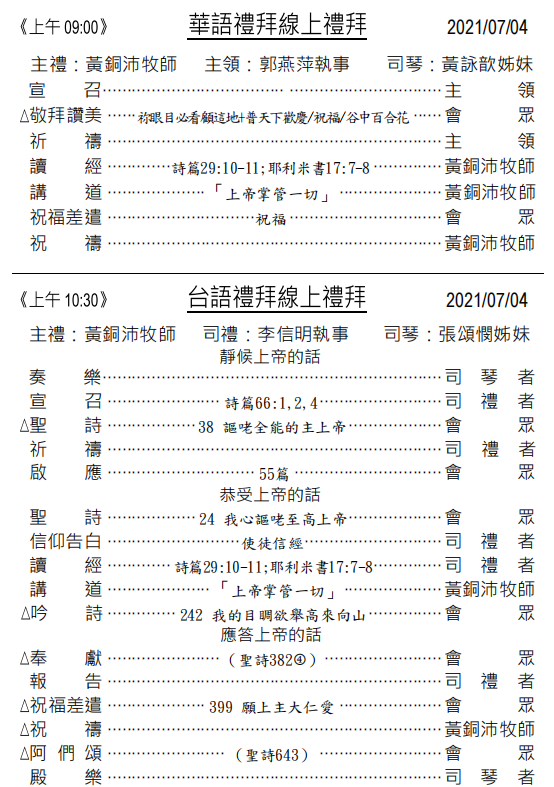◎下週主日兩堂禮拜線上禮拜預告(7月11日)