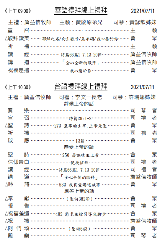 ◎下週主日兩堂禮拜線上禮拜預告(7月18日)