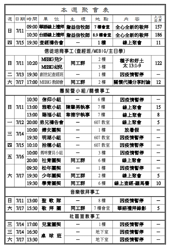 - 防疫政策第三級警戒延到7/26,本會各場次禮拜仍以網絡視訊進行,歡迎兄姊闔家在府上透過網路直播參加禮拜。