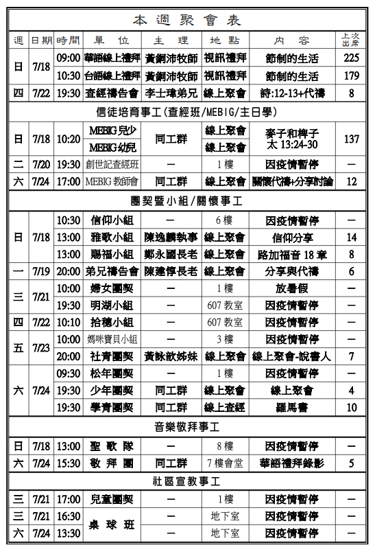 - 防疫政策第三級警戒延到7/26,本會各場次禮拜仍以網絡視訊進行,歡迎兄姊闔家在府上透過網路直播參加禮拜。