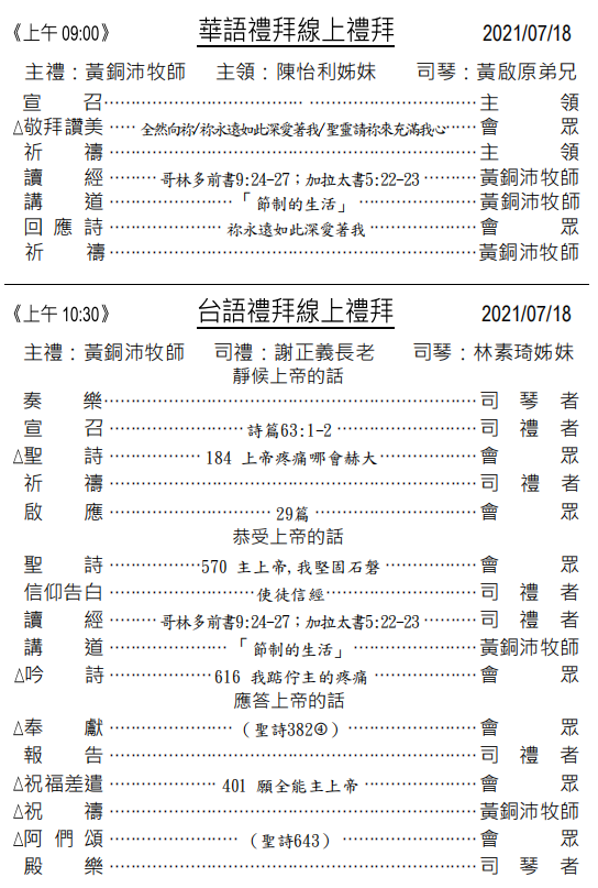 ◎下週主日兩堂禮拜線上禮拜預告(7月25日)