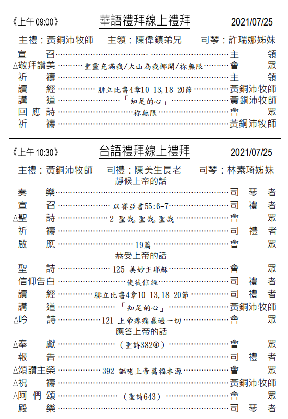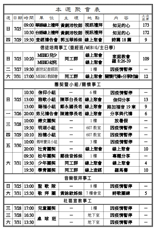 - 本週主日(7/25)維持三堂線上視訊直播(錄影)禮拜,歡迎兄姊同心敬拜。