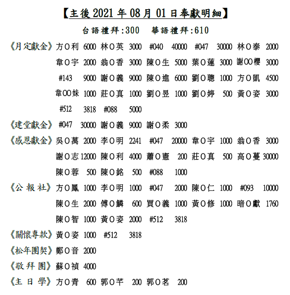 - 轉帳後,請進入教會網站(Line@或官網),點「線上奉獻」表單區,填入:姓名、帳號末5碼、金額、奉獻對象或用途,以便財務組確認奉獻者。