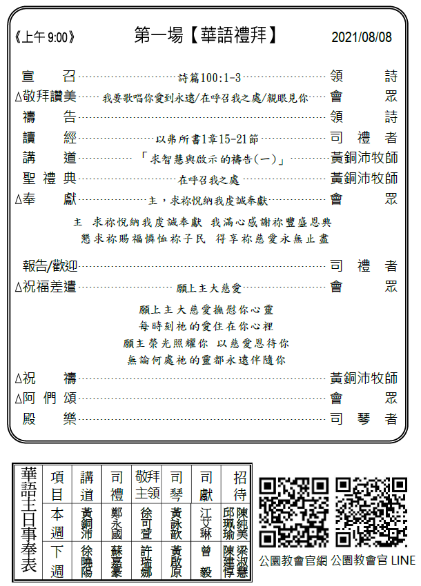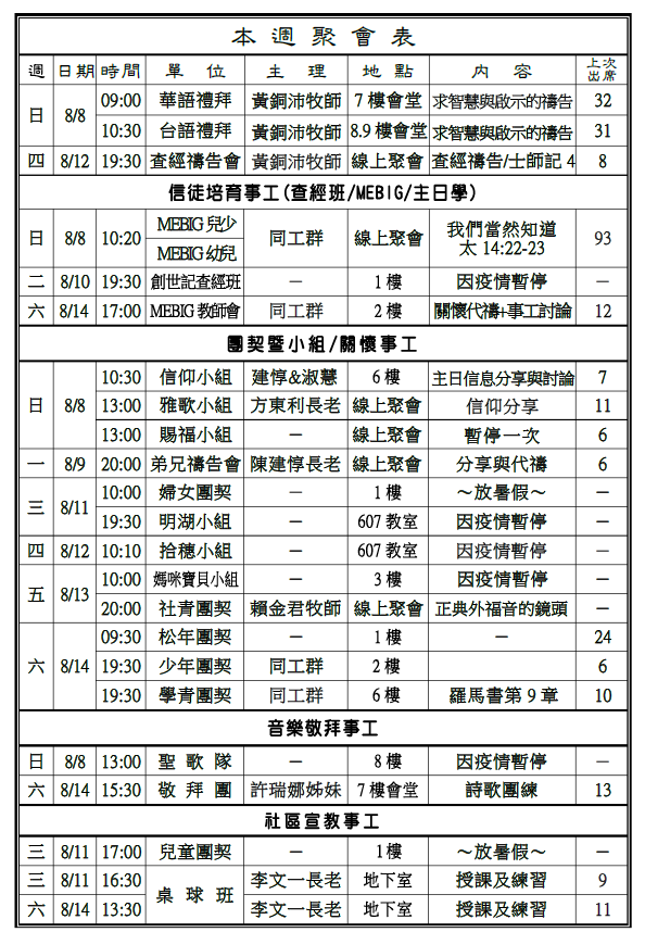 - 本週主日(8/8) 13:00於線上召開長執會,請長執撥冗出席。
