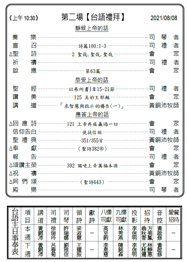 - 本週主日(8/8) 13:00於線上召開長執會,請長執撥冗出席。