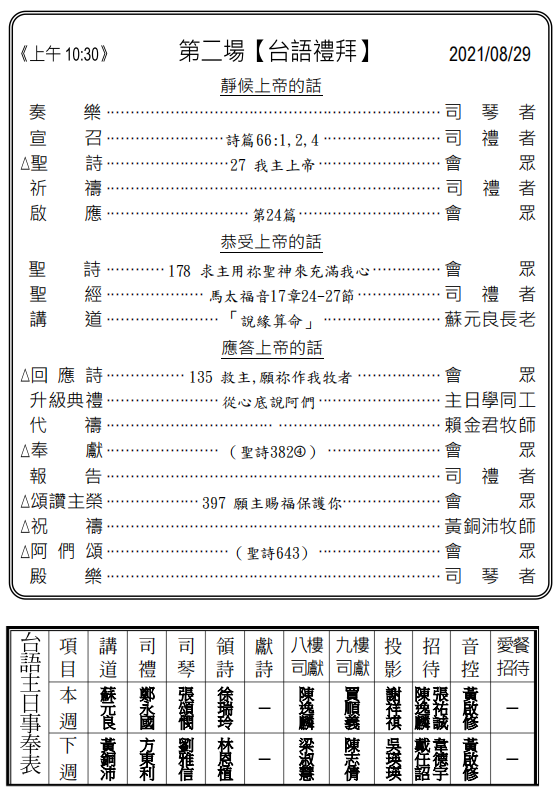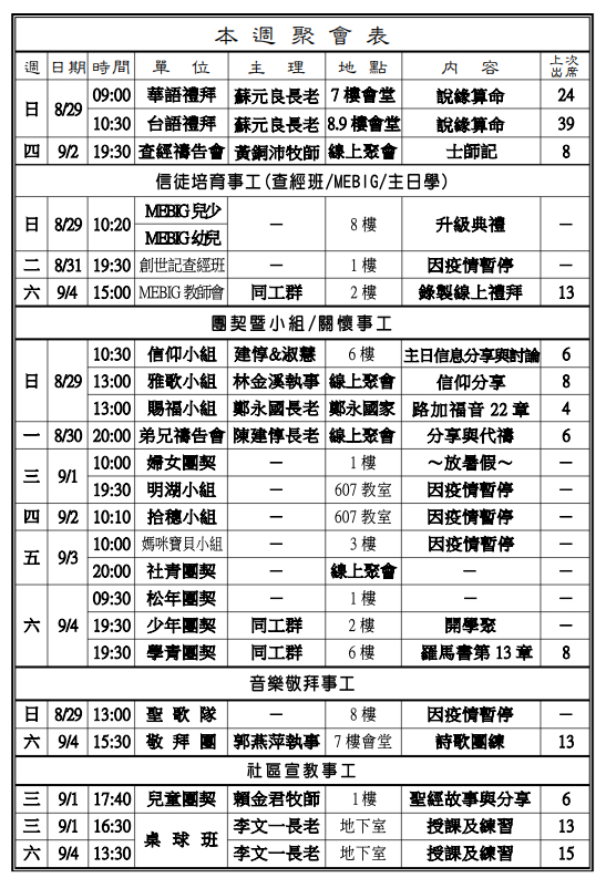 ◎下週主日兩堂禮拜預告(9月5日)