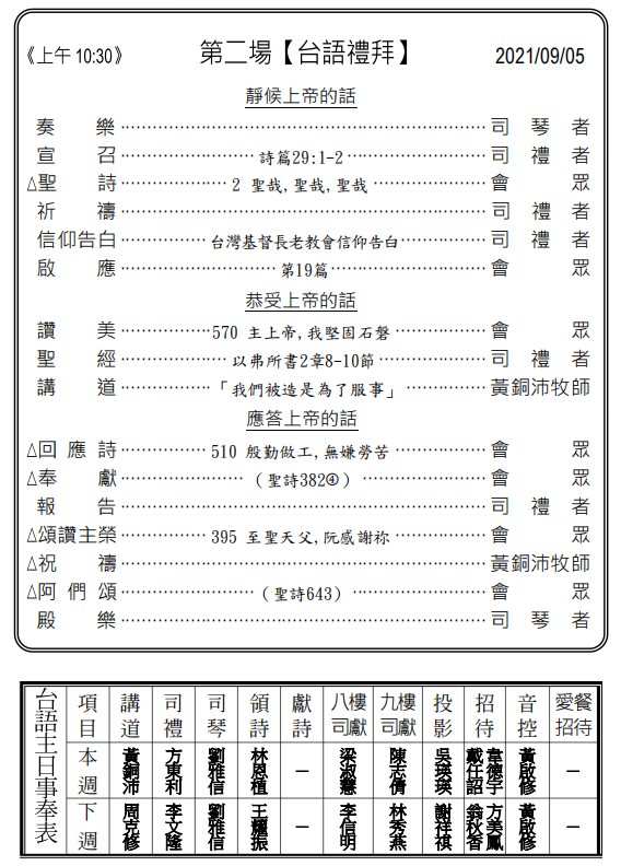 - 台語禮拜:上午10:30-11:40實禮禮拜+網路直播禮拜。
