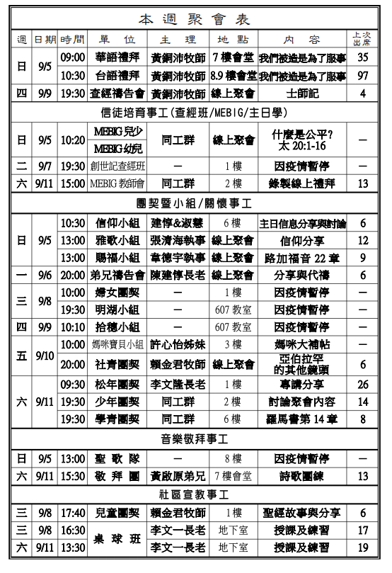 - 本會向內政部申請「主日禮拜與聚會活動防疫計劃」已獲同意,8/22起每場次禮拜室內總容留人數100人,歡迎兄姊參加兩堂主日禮拜。