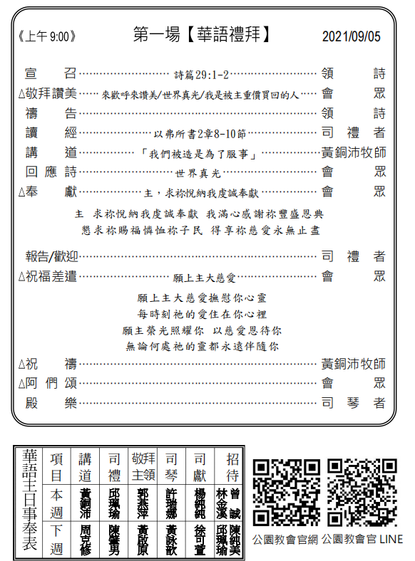 - 華語禮拜:上午09:00-10:10實體禮拜+網路直播禮拜。