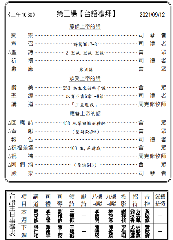※黃牧師前往新竹教會主領兩堂禮拜及小會;金君牧師前往中正教會。