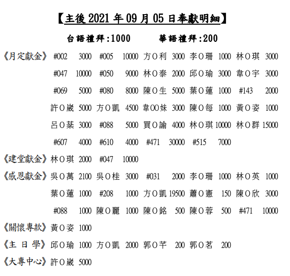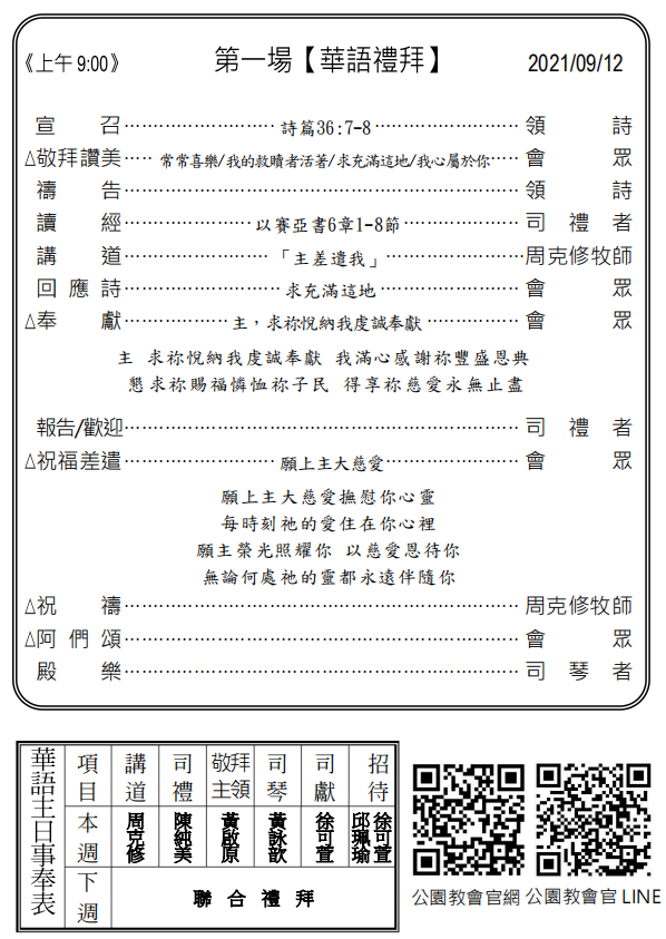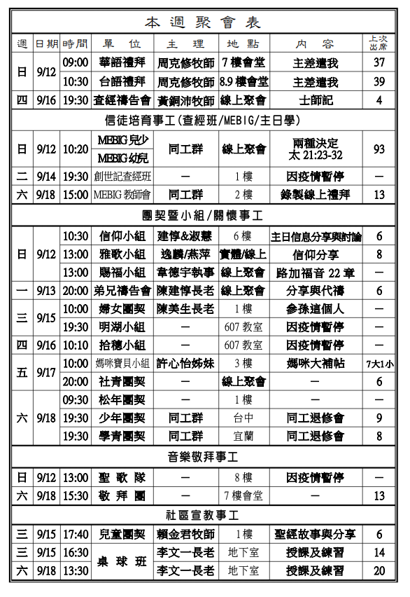 ◎下週主日聯合禮拜預告(9月19日)上午10:30 ※西屯教會募款主日