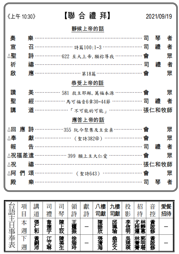 ◎下週主日兩堂禮拜預告(9月26日)