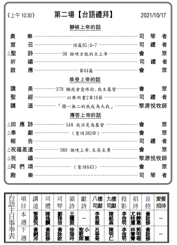 - 下週主日(10/24)聯合禮拜後(12:20)召開長執事工組織會議,請原任及新當選之長執出席參加,地點/七樓副堂。(備有午餐)