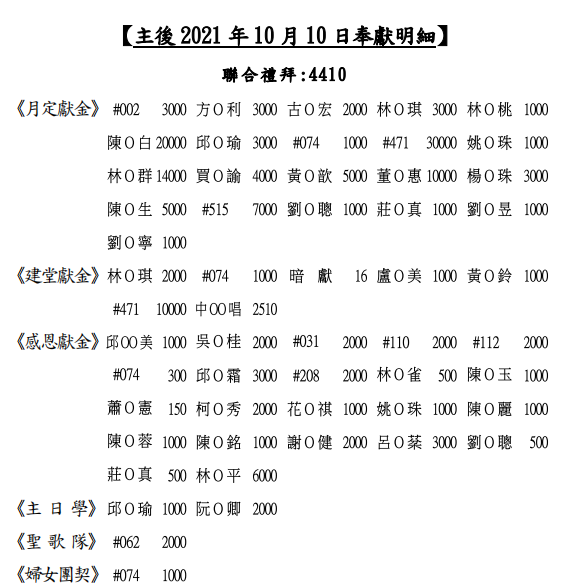 - 轉帳後,請進入教會網站(Line@或官網),點「線上奉獻」表單區,填入:姓名、帳號末5碼、金額、奉獻對象或用途,以便財務組確認奉獻者。