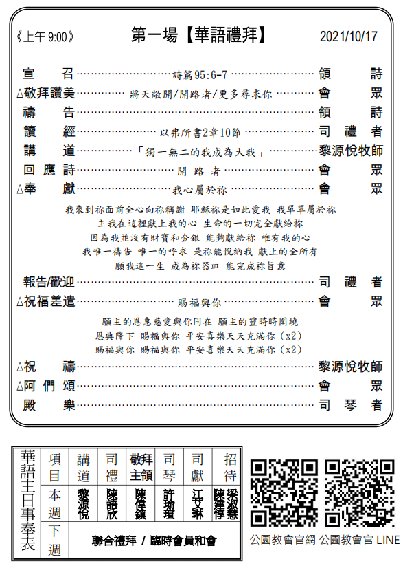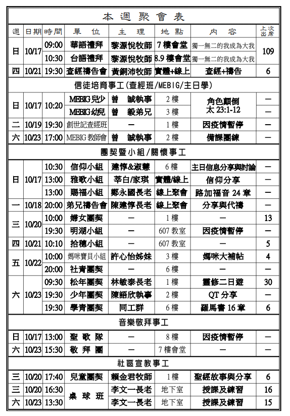 - 本主日(10/17)歡迎黎源悅牧師代表新竹市基督教關懷協會請安、分享事工,並於兩堂禮拜講道。