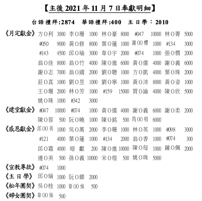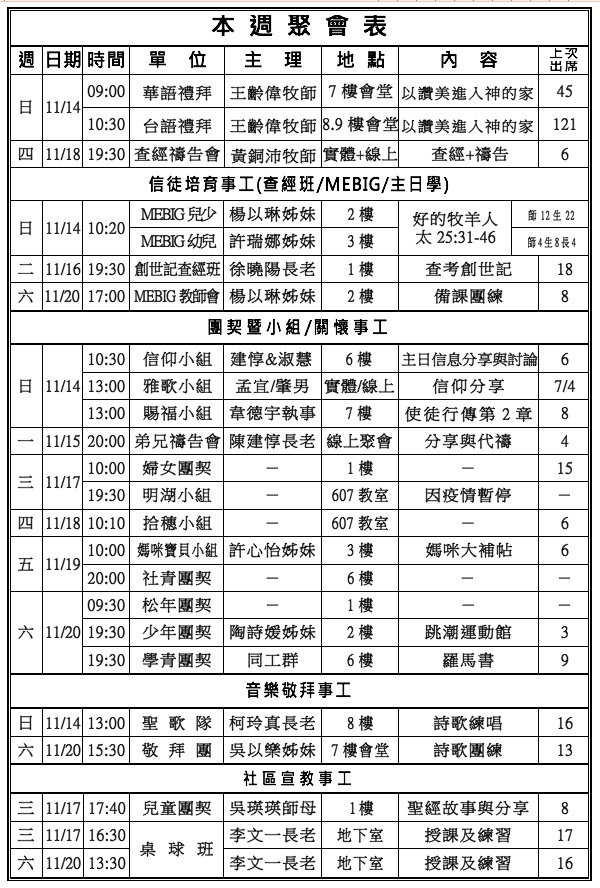 3.下週主日(11/21)築心之家的師生及家長來訪,於台語禮拜分享事工、獻詩及募款,請兄姊關心代禱。