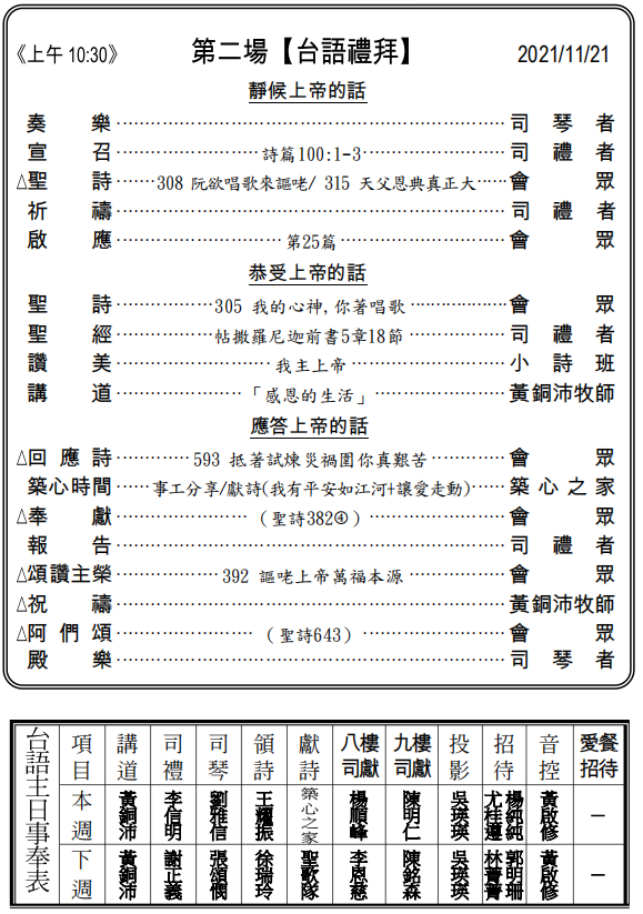- 2022年傳道組事工討論會訂11/21(日)禮拜後(12:30)於6樓607教室召開。(敬備午餐)