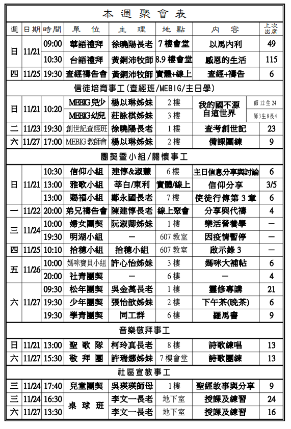 - 本主日(11/21)歡迎築心之家的老師、學生及家長來訪,於台語禮拜分享築心之家的事工、獻詩及募款,請兄姊關心代禱。