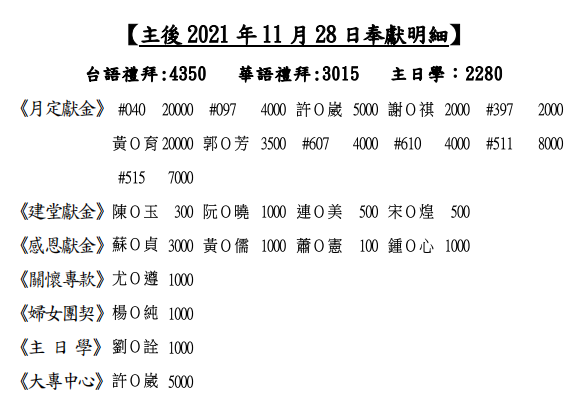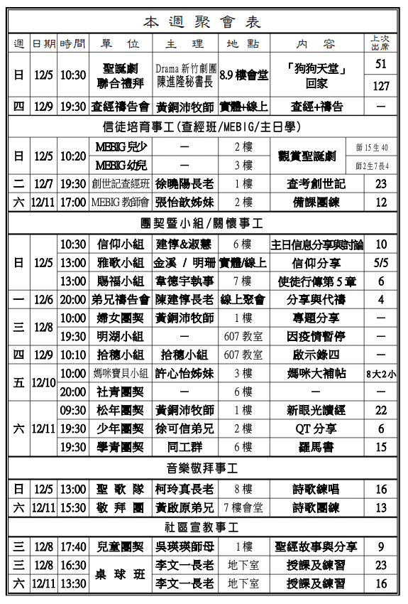- 財務組:兄姊本年度若有奉獻計劃,請於12/26(日)前完成奉獻。本會各團契小組、機構之事工請於12/26(日)結帳,以利年度會計作業。