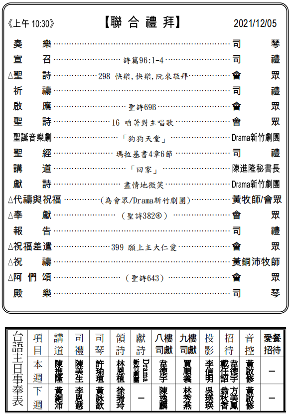 - 本主日(12/5)舉行Drama新竹劇團「狗狗天堂」首演暨差遣禮拜,講道:彩虹生命教育協會陳進隆秘書長。本主日禮拜聯合,時間/上午10:30,歡迎兄姊及社區朋友參加。